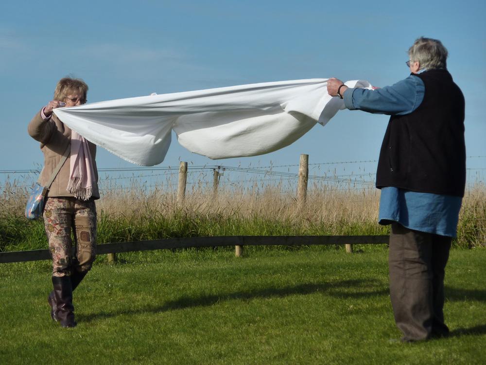 Lifting a folded sheet from the top of one of two piles of sheets and asking another person to unfold the sheet with you.