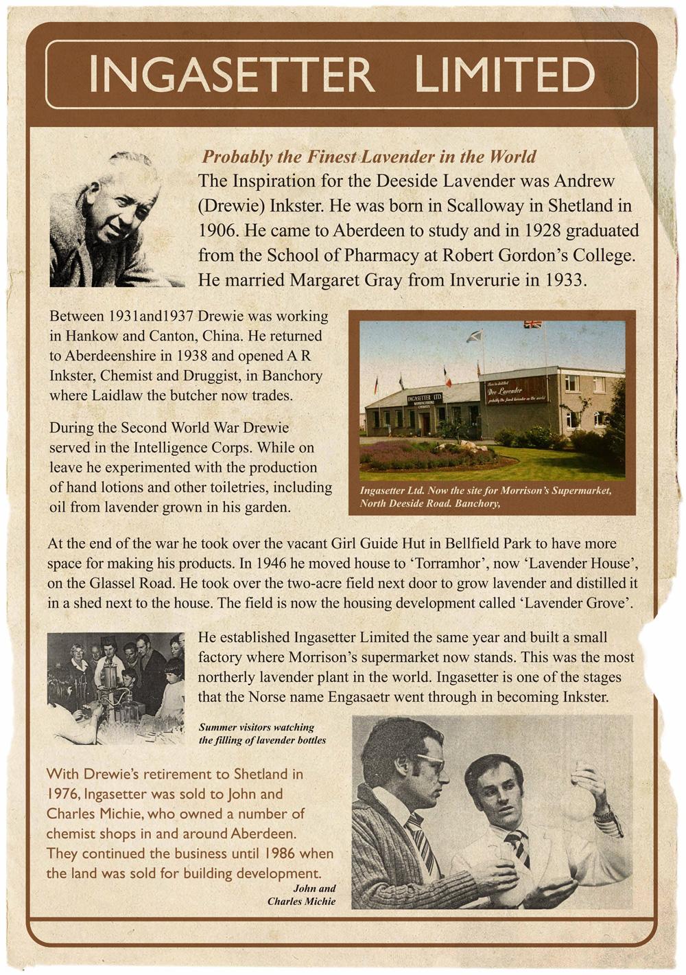 Tim Upson and Susyn Andrews in their taxonomy of ‘The Genus Lavandula’ identified a cultivar of Lavender, developed commercially by Chemist, Andrew (Drewie) Inkster, that is specific to Banchory. Once this subject was agreed the group met regularly to uncover the reasons why lavender thrived ecologically and commercially on Deeside from 1946 until it ceased trading in 1989.